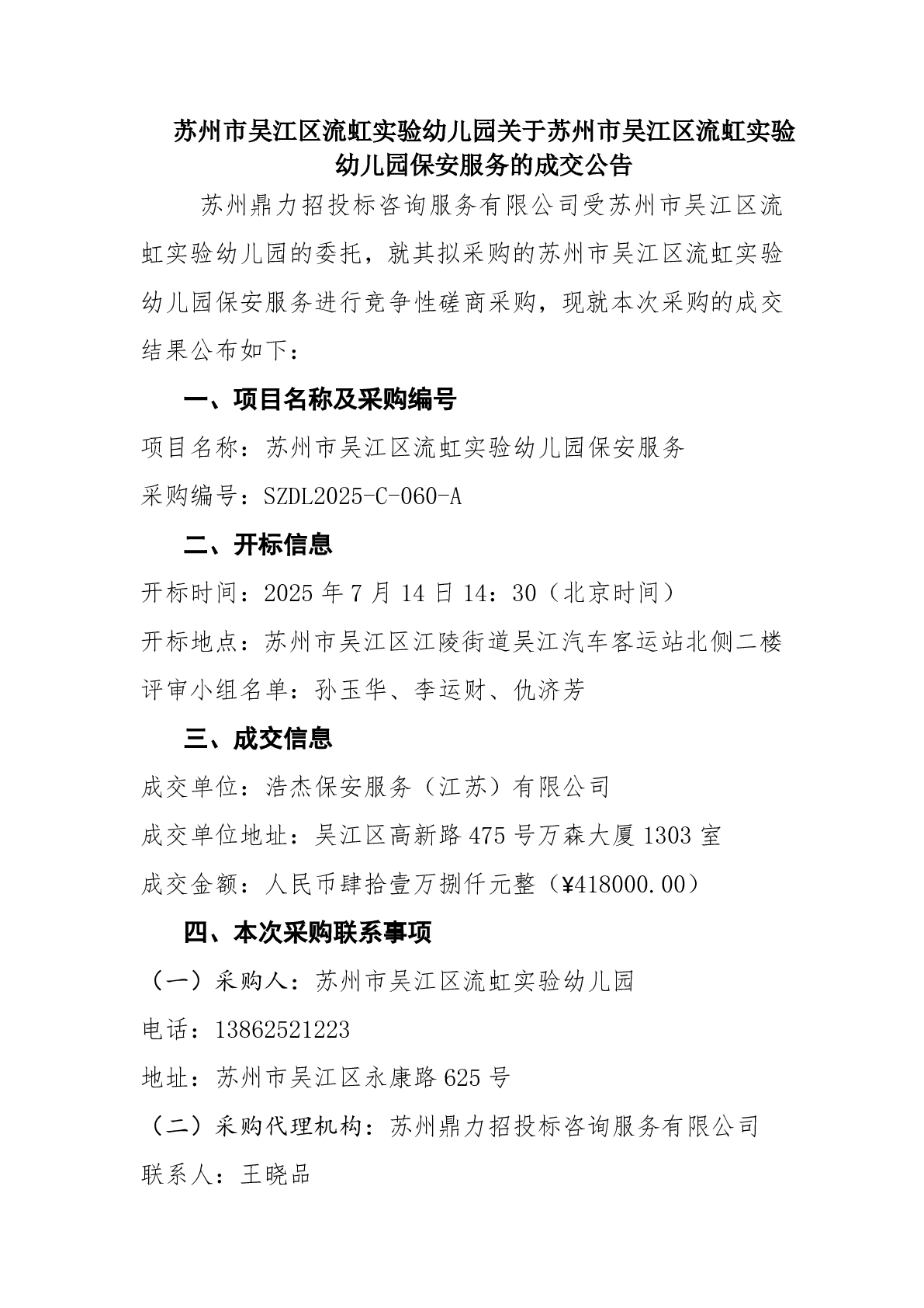 苏州市吴江区流虹实验幼儿园关于苏州市吴江区流虹实验幼儿园保安服务的成交公告